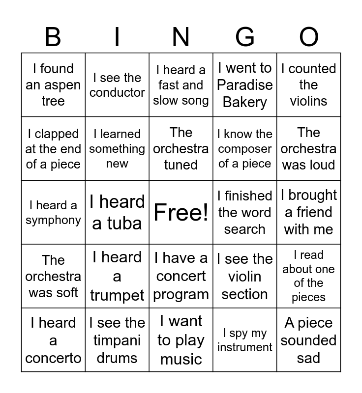This bingo card has a free space and 24 words: I heard a trumpet, I see the timpani drums, The orchestra tuned, I heard a concerto, I counted the violins, I found an aspen tree, I clapped at the end of a piece, I see the conductor, I finished the word search, I have a concert program, I know the composer of a piece, I heard a symphony, I see the violin section, I read about one of the pieces, I learned something new, I spy my instrument, I brought a friend with me, I heard a fast and slow song, The orchestra was loud, I heard a tuba, A piece sounded sad, The orchestra was soft, I went to Paradise Bakery and I want to play music.