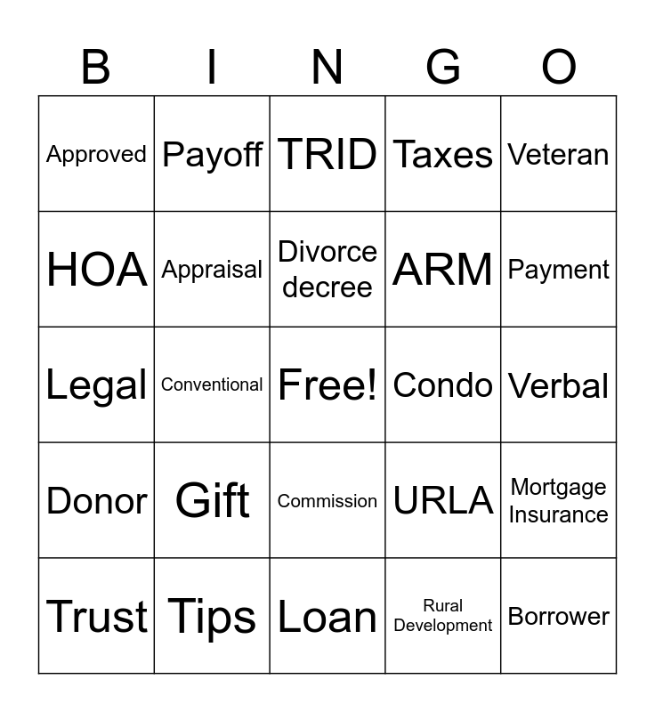 This bingo card has a free space and 49 words: FHA, Borrower, Earnest money, Loan, Gift, Credit, Payoff, Flood, HOA, Survey, Appraisal, Taxes, Mortgage Insurance, URLA, Assets, Tax return, Divorce decree, Condo, Spouse, Veteran, Conventional, Rural Development, Approved, ARM, Rate, Payment, Trust, POA, Commission, Donor, Bank Statement, Deposit, Non-Traditional, Alimony, Tips, OT, Lender, MI, Verbal, W-2, Proceeds, Lock, Paystub, Balloon, Legal, TRID, VOE, Judgement and Escrow.