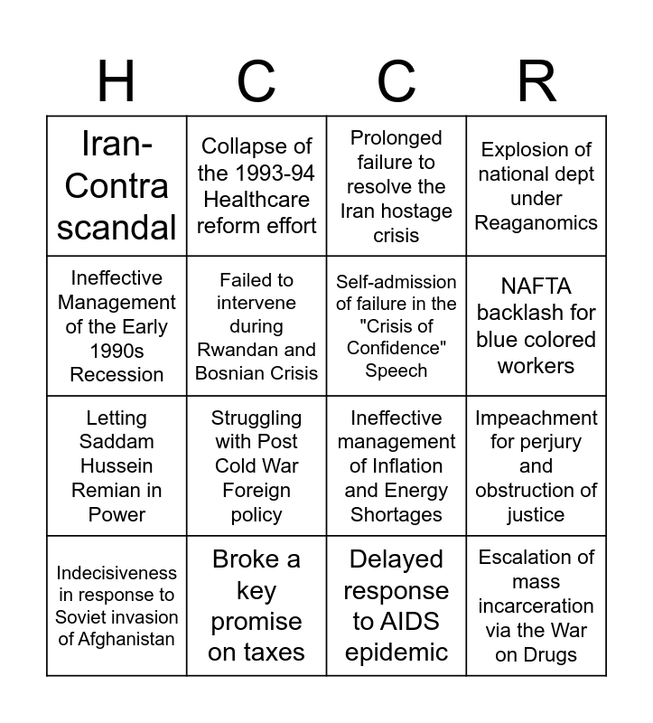 This bingo card has 16 words: Broke a key promise on taxes, Impeachment for perjury and obstruction of justice, Prolonged failure to resolve the Iran hostage crisis, Iran-Contra scandal, Letting Saddam Hussein Remian in Power, Collapse of the 1993-94 Healthcare reform effort, Ineffective management of Inflation and Energy Shortages, Delayed response to AIDS epidemic, Ineffective Management of the Early 1990s Recession, Failed to intervene during Rwandan and Bosnian Crisis, Indecisiveness in response to Soviet invasion of Afghanistan, Explosion of national dept under Reaganomics, Struggling with Post Cold War Foreign policy, NAFTA backlash for blue colored workers, Self-admission of failure in the "Crisis of Confidence" Speech and Escalation of mass incarceration via the War on Drugs.