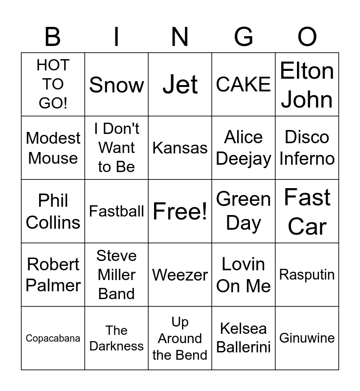 This bingo card has a free space and 55 words: Dancing Queen, Copacabana, I Miss You, HOT TO GO!, Up Around the Bend, Get Lucky, I Don't Want to Be, All my Ex's Live In Texas, Alice Deejay, Bananarama, CAKE, Cascada, Bee Gees, Counting Crows, Dire Straits, Earth, Wind & Fire, Elton John, Fastball, The Fireman, Ginuwine, Green Day, Take Me to Church, Lovin On Me, Jet, Jon Pardi, Kansas, Kelsea Ballerini, Kris Kross, Fast Car, Rasputin, Stick Season, Little Talks, Counting Stars, Ain't It Fun, Modest Mouse, Phil Collins, Queen, Robert Palmer, Sister Hazel, Smash Mouth, Snow, Magic Carpet Ride, Surfin' U.S.A., Twist And Shout, Steve Miller Band, The Darkness, The Jacksons, The Killers, Satisfaction, Disco Inferno, Uncle Kracker, Vampire Weekend, Village People, Weezer and Wolfmother.