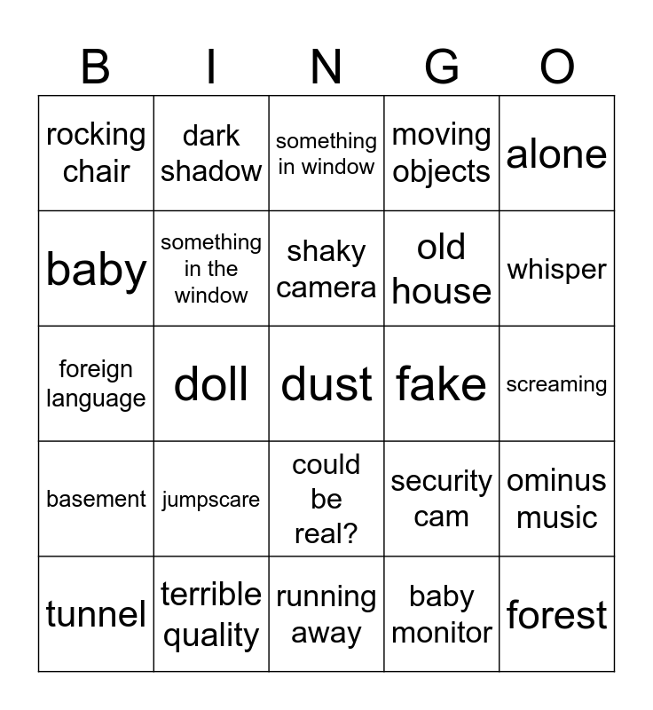 This bingo card has a free space and 24 words: jumpscare, terrible quality, shaky camera, tunnel, alone, rocking chair, baby, dark shadow, fake, could be real?, old house, foreign language, security cam, ominus music, something in the window, baby monitor, screaming, something in window, whisper, doll, forest, basement, moving objects and running away.