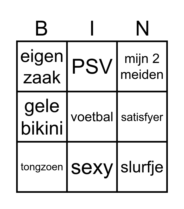 This bingo card has a free space and 8 words: satisfyer, mijn 2 meiden, PSV, tongzoen, eigen zaak, slurfje, gele bikini and sexy.