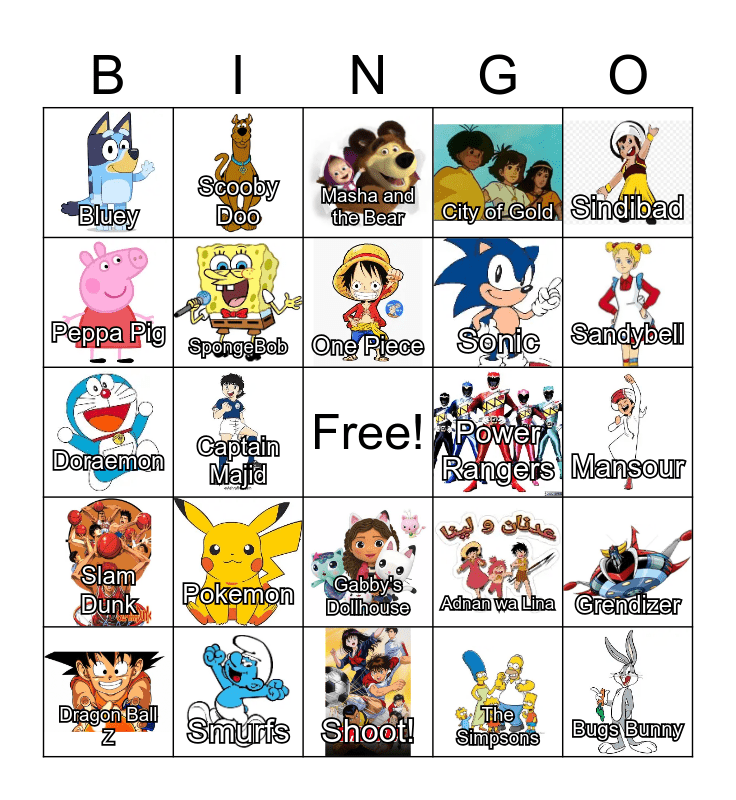 This bingo card has 29 images, a free space and 29 words: Road Runner, Smurfs, Masha and the Bear, Ninja Sasuke, Sindibad, Bluey, SpongeBob, One Piece, Power Rangers, Grendizer, Dragon Ball Z, Captain Majid, The Simpsons, Bugs Bunny, Doraemon, Tom and Jerry, Shoot!, Adnan wa Lina, Sandybell, Slam Dunk, Pokemon, Remi, Sonic, Mansour, Peppa Pig, Scooby Doo, Gabby's Dollhouse, City of Gold and Phineas and Ferb.