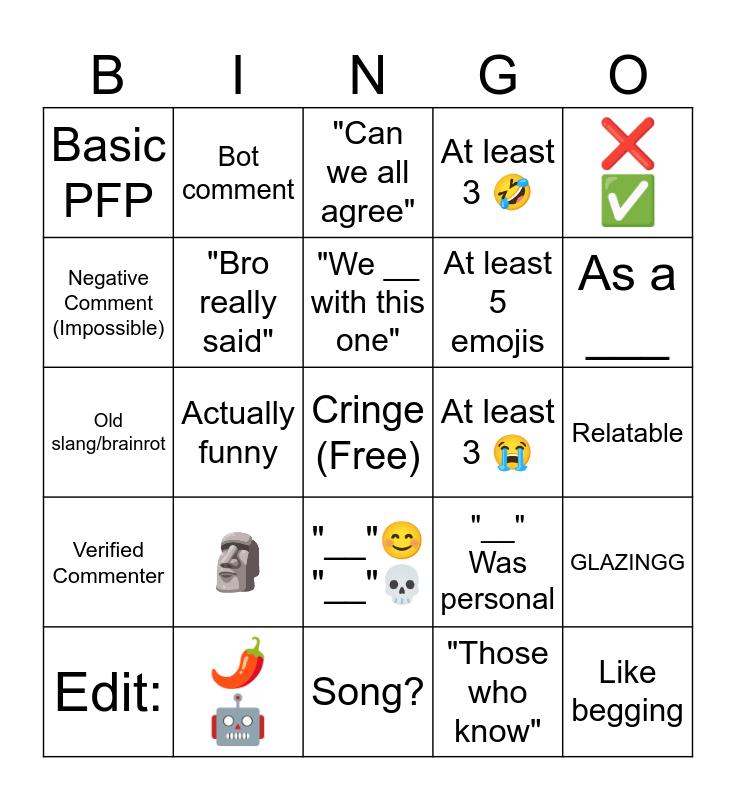 This bingo card has a free space and 39 words: POV:, "Thought we wouldn't notice", I predict comment, "Bro really said", Edit:, "__"😊 "__"💀, "We __ with this one", At least 3 💀, ❌ ✅, Verified Commenter, Actually funny, At least 3 🤣, Like begging, Relatable, At least 3 😭, 🗿, At Least 2 Bros, Basic PFP, "Bro can't get cancelled", "__" Was personal, Negative Comment (Impossible), Song?, At least 5 emojis, As a ___, Explaining the video, Phonk edit (Free), Direct Quote, Almost the same comment, All Bots, Bot comment, Little Kid, (Not forcing), "Can we all agree", 🌶️🤖, "Those who know", Respect edit or smth, GLAZINGG, Old slang/brainrot and Pure slop.