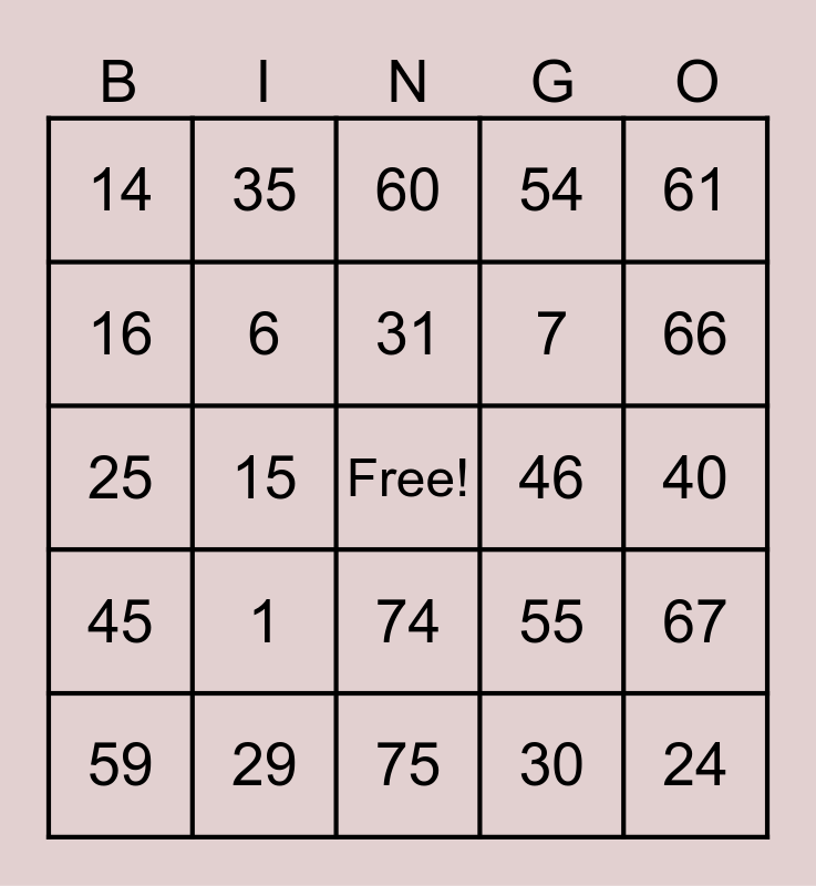 This bingo card has a free space and 24 words: 1, 29, 31, 59, 61, 14, 16, 35, 46, 74, 7, 25, 55, 67, 6, 30, 40, 60, 66, 15, 24, 45, 54 and 75.
