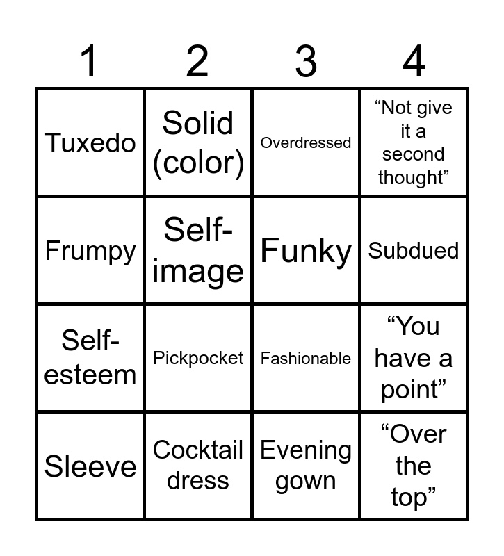 This bingo card has 40 words: Trendy, Fashionable, Stylish, Funky, Classic, Elegant, Subdued, Loud, Frumpy, “Over the top”, “You have a point”, “Not give it a second thought”, Sleeve, Evening gown, Cocktail dress, Dress shirt, Low cut, Tuxedo, Underdressed, Overdressed, Mislabel, Self-confidence, Self-esteem, Self-image, Self-pity, Self-centered, Self-confident, Self-conscious, Self-critical, “Takes some getting used to”, “A mixed blessing”, “Mind one’s own business”, Foreign, Stand out, Pickpocket, Purse-snatcher, Mugger, Striped, Solid (color) and Plaid.