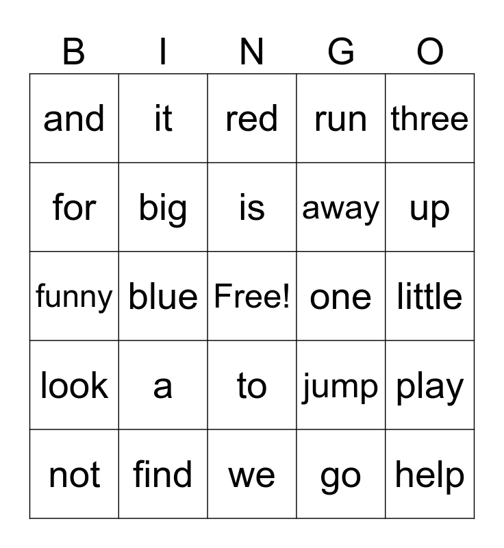 This bingo card has a free space and 24 words: a, find, is, not, three, and, for, it, one, to, away, funny, jump, play, big, go, little, red, up, blue, help, look, run and we.