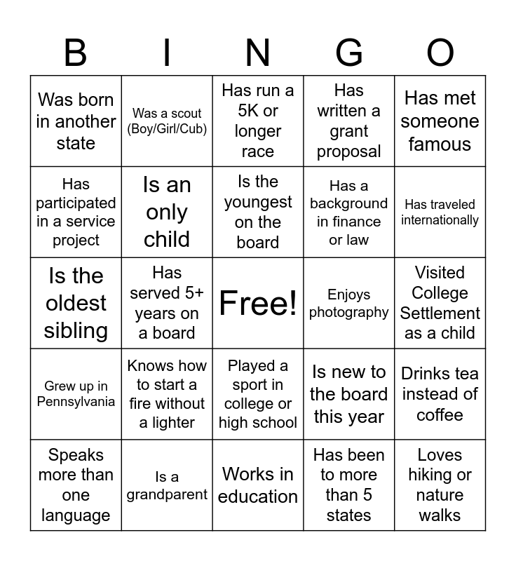 This bingo card has a free space and 29 words: Speaks more than one language, Has a hidden talent, Has served 5+ years on a board, Has worked at a summer camp, Was born in another state, Has run a 5K or longer race, Is an only child, Knows how to start a fire without a lighter, Enjoys photography, Is a grandparent, Visited College Settlement as a child, Loves hiking or nature walks, Works in education, Has been to more than 5 states, Has traveled internationally, Enjoys gardening, Played a sport in college or high school, Grew up in Pennsylvania, Has met someone famous, Is the oldest sibling, Is new to the board this year, Enjoys gardening, Has a background in finance or law, Has participated in a service project, Has written a grant proposal, Was a scout (Boy/Girl/Cub), Drinks tea instead of coffee, Is the youngest on the board and Is an alumni of College Settlement Camp.