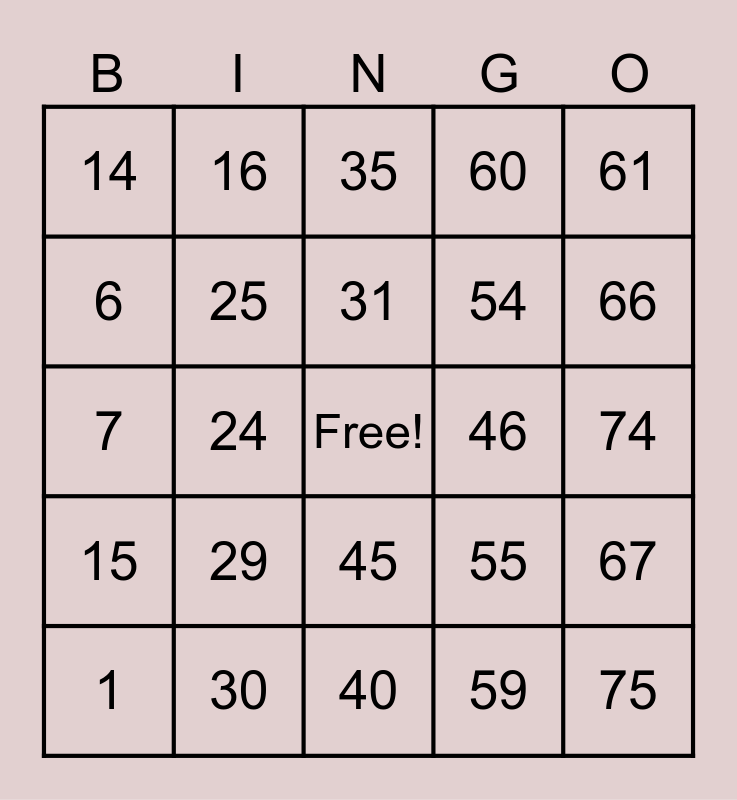 This bingo card has a free space and 24 words: 1, 29, 31, 59, 61, 14, 16, 35, 46, 74, 7, 25, 55, 67, 6, 30, 40, 60, 66, 15, 24, 45, 54 and 75.