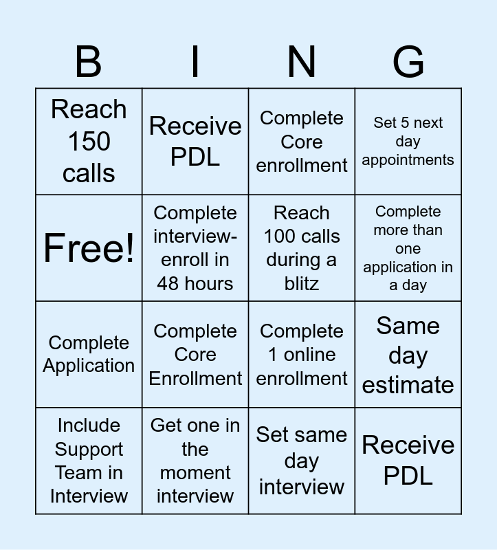 This bingo card has 16 words: Get one in the moment interview, Same day estimate, Complete Core enrollment, Reach 150 calls, Complete Application, Receive PDL, Complete 1 online enrollment, Set same day interview, Free!, Complete interview-enroll in 48 hours, Include Support Team in Interview, Set 5 next day appointments, Complete Core Enrollment, Complete more than one application in a day, Reach 100 calls during a blitz and Receive PDL.