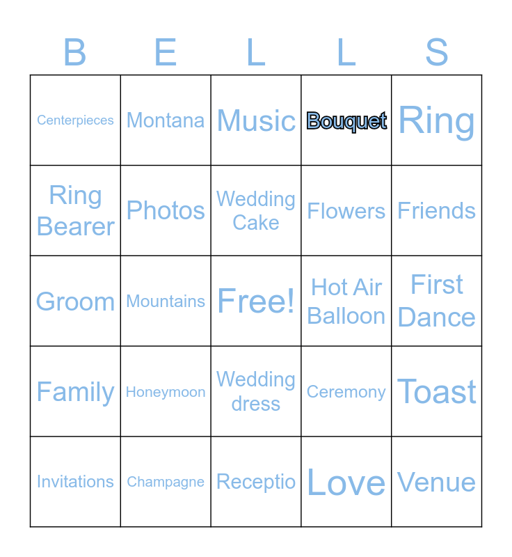 This bingo card has a free space and 24 words: Honeymoon, Champagne, Wedding Cake, Invitations, Ring, Centerpieces, Ring Bearer, Montana, Hot Air Balloon, Wedding dress, Flowers, Groom, Ceremony, Toast, Photos, Love, First Dance, Music, Friends, Mountains, Venue, Family, Bouquet and Receptio.
