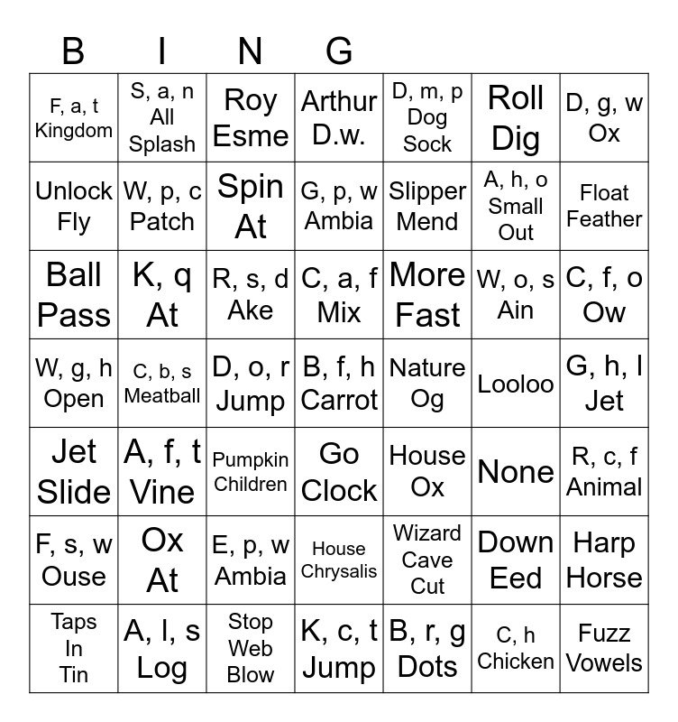 This bingo card has 104 words: Free!, Taps In Tin, D, m, p Dog Sock, A, l, r Big, B, f, u P, Horse Jump, Q, g, r Ook, Fox Party, Fuzz Vowels, Moon Ain, D, s, f Wordgirl, Thing Splash, C, h Chicken, Diphthong Digraph, Dinosaur Us Tree, F, s, w Ouse, Roy Esme, Light Kick, G, s, t Og, B, d, r Tree, Pocoyo Pop, Pole Key, A, l, s Log, G, h, i Door, Wizard Cave Cut, R, s, d Ake, Spin At, Arthur D.w., L, r, d Ell, F, n Sticks, More Fast, D, o, r Jump, C, u, p Ox, K, c, t Jump, Pumpkin Children, House Ox, G, p, v Balloon, B, y, t Fair, Unlock Fly, W, g, h Open, U, m, p Sky, K, q At, A, f, t Vine, Roll Dig, Down Eed, F, a, t Kingdom, E, l, s Ing, A, h, o Small Out, Straw Icks, B, f, h Carrot, N, y, e Elinor, Nature Og, G, h, l Jet, Bo Pull, Fly Dance, D, b, x Clean, Gbsd Cheese, Friend Y, A, g, l Ain, C, a, f Mix, Ball Pass, Drop Lift, W, o, e Mia, D, g, v Ail, Xavier Presidents, Go Clock, Nice Prairie, S, a, n All Splash, G, p, w Ambia, Slipper Mend, C, b, s Meatball, F, p, z Ish, Saddle Spin, A, c, z Ant, Harp Horse, Kid Ouse, Car Ouse, C, f, o Ow, B, r, g Dots, Peanut Sun, M, j, n Moogoopi, Stop Web Blow, D, g, w Ox, Banana Ail, Float Feather, Ramp Pig, en, Looloo, Rev Roll, Ox At, None, Moon Og, Clifford At, Playground Kid Eeze, W, o, s Ain, R, c, f Animal, Pinkalicious Fix, L, w, h Ouse, W, p, c Patch, Jet Slide, D, f, c Clubhouse, G, m, u House, E, p, w Ambia, House Chrysalis and Fizzy Zipline.