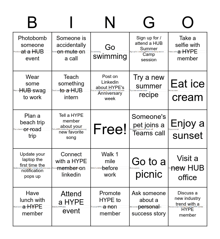 This bingo card has 24 images, a free space and 24 words: Connect with a HYPE member on linkedin, Attend a HYPE event, Post on Linkedin about HYPE's Anniversary week, Have lunch with a HYPE member, Take a selfie with a HYPE member, Photobomb someone at a HUB event, Wear some HUB swag to work, Someone is accidentally on mute on a call, Someone's pet joins a Teams call, Walk 1 mile before work, Try a new summer recipe, Plan a beach trip or road trip, Go to a picnic, Visit a new HUB office, Teach something to a HUB intern, Ask someone about a personal success story, Enjoy a sunset, Go swimming, Eat ice cream, Tell a HYPE member about your new favorite song, Discuss a new industry trend with a HYPE member, Update your laptop the first time the notification pops up, Sign up for / attend a HUB Summer Camp session and Promote HYPE to a non member.