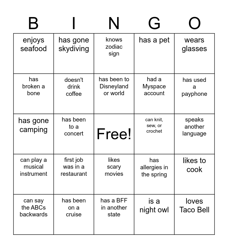 This bingo card has a free space and 64 words: has traveled out of the country, has a significant other, can ride a bike, likes to cook, doesn't watch Netflix, favorite season is winter, has gone skydiving, doesn't like pizza, has been to Disneyland or world, is allergic to dogs, likes scary movies, has sung karaoke, speaks another language, wears glasses, is left-handed, has broken a bone, has been to a concert, enjoys seafood, has 2 or more siblings, had a Myspace account, first job was in a restaurant, can play a musical instrument, has a pet, is an early bird, has a garden, has made bread from scratch, can name all 50 states, loves olives, was born on the west coast, has a vacation planned, can drive a car, has a tattoo, has a piercing, has run a 5K, has used a payphone, can say the ABCs backwards, has won on a scratch-off, is a night owl, can whistle, doesn't drink coffee, has gone camping, can knit, sew, or crochet, likes to do yoga, can build a fire, is scuba certified, loves Taco Bell, has been on a cruise, has been to the movies this month, has allergies in the spring, has been below the equator, can use chopsticks, likes to swim in the ocean, has a BFF in another state, has a bartending license, doesn't drink soda, wears perfume or cologne, knows zodiac sign, has driven a boat, likes pulp in OJ, can drive stick shift, afraid of heights, has lived in 3+ places, has been to a resort and is a foodie.