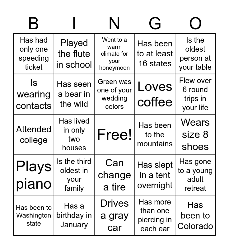 This bingo card has a free space and 24 words: Is the third oldest in your family, Has a birthday in January, Green was one of your wedding colors, Has been to Washington state, Is the oldest person at your table, Has had only one speeding ticket, Is wearing contacts, Played the flute in school, Has been to the mountains, Can change a tire, Loves coffee, Attended college, Has slept in a tent overnight, Has gone to a young adult retreat, Has seen a bear in the wild, Has more than one piercing in each ear, Wears size 8 shoes, Went to a warm climate for your honeymoon, Flew over 6 round trips in your life, Has lived in only two houses, Has been to Colorado, Plays piano, Has been to at least 16 states and Drives a gray car.