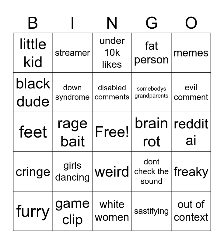 This bingo card has a free space and 24 words: girls dancing, game clip, disabled comments, furry, memes, little kid, black dude, streamer, brain rot, weird, somebodys grandparents, feet, dont check the sound, freaky, down syndrome, sastifying, reddit ai, under 10k likes, evil comment, rage bait, out of context, cringe, fat person and white women.