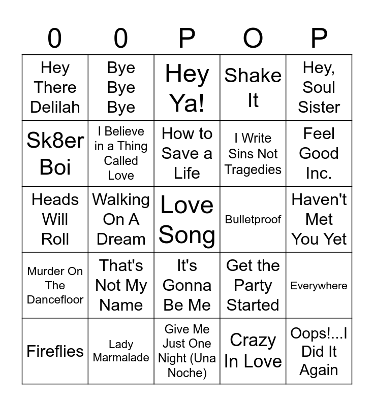 This bingo card has 60 words: Can't Fight the Moonlight, Lady Marmalade, Yeah!, Murder On The Dancefloor, Crazy In Love, Apologize, I Believe in a Thing Called Love, Pieces of Me, I Write Sins Not Tragedies, Sugar, We're Goin Down, Shake It, I Don't Want to Be, Sk8er Boi, Sitting, Waiting, Wishing, Electric Feel, Hey There Delilah, Love Song, Hey, Soul Sister, The Sweet Escape, How to Save a Life, Bulletproof, Hey Ya!, Fireflies, Everywhere, Waiting On the World to Change, Beautiful Day, California - Tchad Blake Mix, How You Remind Me, Feel Good Inc., Follow Me, This Love, Who Knew, I Don't Feel Like Dancin', Party In The U.S.A., Bye Bye Bye, Clint Eastwood, Young Folks, Walking On A Dream, Better Together, Heads Will Roll, Shut Up And Drive, That's Not My Name, Haven't Met You Yet, Crazy, Get the Party Started, With Arms Wide Open, Viva La Vida, It's My Life, Wherever You Will Go, It's Gonna Be Me, Give Me Just One Night (Una Noche), Ocean Avenue, You're Beautiful, Absolutely (Story of a Girl), Hanging By A Moment, Breakeven, Suddenly I See, I'm A Slave 4 U, Oops!...I Did It Again and I Gotta Feeling.