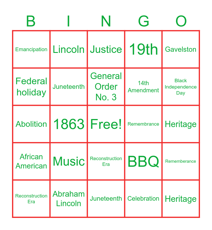 This bingo card has a free space and 59 words: BBQ, Abraham Lincoln, 13th Amendment, African American, Celebration, June, Juneteenth, Music, 14th Amendment, Union Army, 19th, 1865, Federal holiday, Federal Holiday, Freedom, Emancipation, Heritage, Gavelston, 2021, General Order No. 3, Remembrance, Justice, Reconstruction Era, Rememberance, Fredrick Douglass, BBQ, Jubilee Day, Empowerment, Black Independence Day, Texas, June, 19th, Freedom, General Order No. 3, Lincoln, Celebration, 1865, 1863, Emancipation Proclamation, Abolition, 13th Amendment, Music, Heritage, Justice, African American, 14th Amendment, Galveston, 2021, Reconstruction Era, Juneteenth, Union Army, Federal Holiday, 2021, Remembrance, Fredrick Douglass, BBQ, Jubilee Day, Empowerment and Black Independence Day.