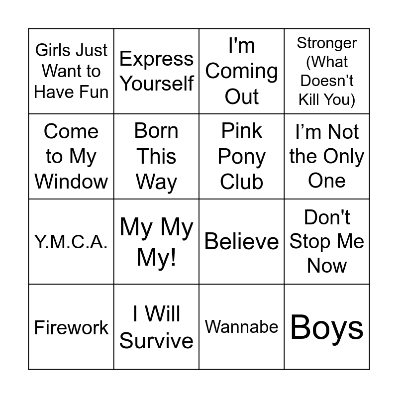 This bingo card has 16 words: I Will Survive, Don't Stop Me Now, I'm Coming Out, Girls Just Want to Have Fun, Y.M.C.A., Express Yourself, Believe, Wannabe, Come to My Window, Born This Way, Firework, Stronger (What Doesn’t Kill You), My My My!, I’m Not the Only One, Pink Pony Club and Boys.