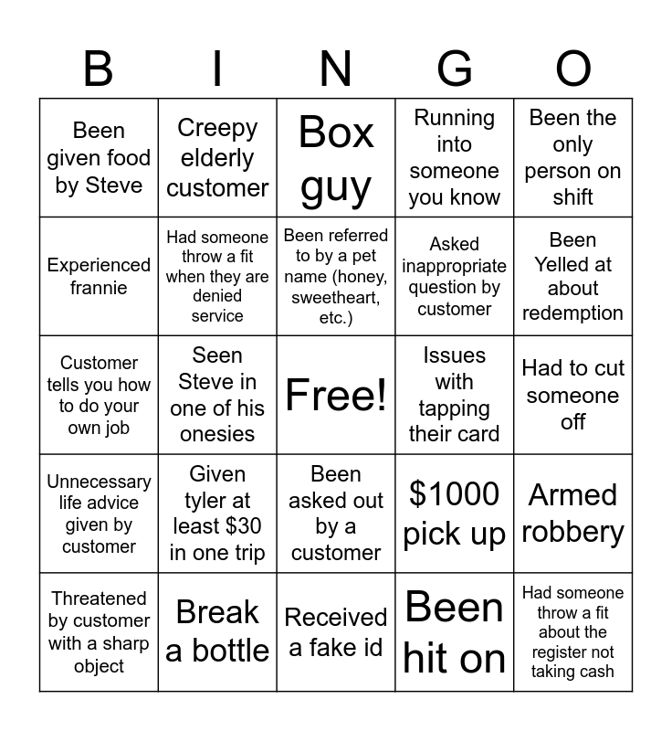 This bingo card has a free space and 28 words: Armed robbery, Threatened with bomb, Asked inappropriate question by customer, Been hit on, Experienced frannie, Box guy, Creepy elderly customer, Unnecessary life advice given by customer, Issues with tapping their card, Threatened by customer with a sharp object, Customer tells you how to do your own job, Running into someone you know, Break a bottle, Received a fake id, Been Yelled at about redemption, Been Yelled at about not paying attention, Given tyler at least $30 in one trip, Had someone throw a fit when they are denied service, Been referred to by a pet name (honey, sweetheart, etc.), Been asked out by a customer, Been given food by Steve, “The nips are wrong”, Had someone throw a fit about the register not taking cash, Seen Steve in one of his onesies, Had to cut someone off, $1000 pick up, Been the only person on shift and No cash left in the drawer at pick up.