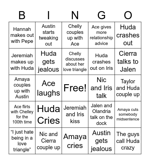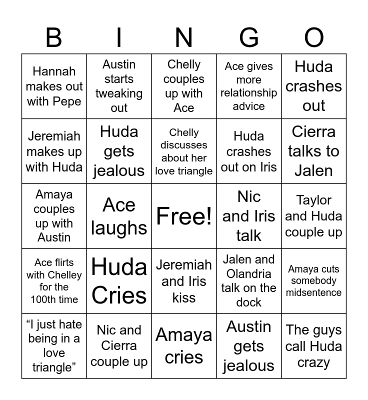 This bingo card has a free space and 24 words: “I just hate being in a love triangle”, Huda Cries, Chelly discusses about her love triangle, Austin gets jealous, Huda crashes out, Hannah makes out with Pepe, Austin starts tweaking out, Chelly couples up with Ace, Nic and Iris talk, Taylor and Huda couple up, Amaya couples up with Austin, Huda gets jealous, Jalen and Olandria talk on the dock, Amaya cuts somebody midsentence, Jeremiah makes up with Huda, Nic and Cierra couple up, Amaya cries, Ace gives more relationship advice, Cierra talks to Jalen, Ace flirts with Chelley for the 100th time, Ace laughs, Jeremiah and Iris kiss, Huda crashes out on Iris and The guys call Huda crazy.