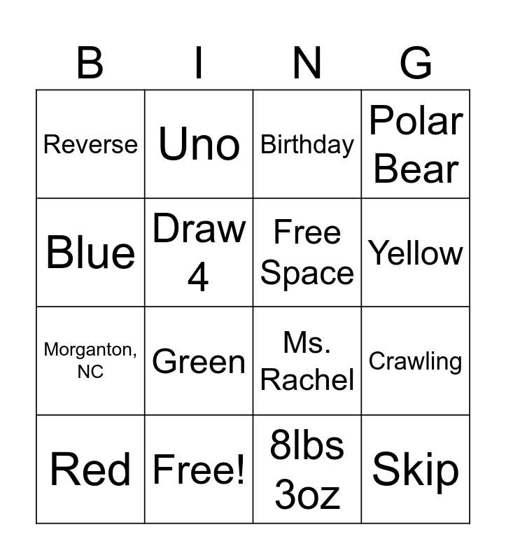 This bingo card has 22 words: Free!, Niko, Uno, Cake, Draw 4, Free Space, Reverse, Birthday, Ms. Rachel, Skip, Morganton, NC, Polar Bear, Toy Story, 8:50am, 8lbs 3oz, June 19th, Crawling, Red, Green, Blue, Yellow and Moo Cow.
