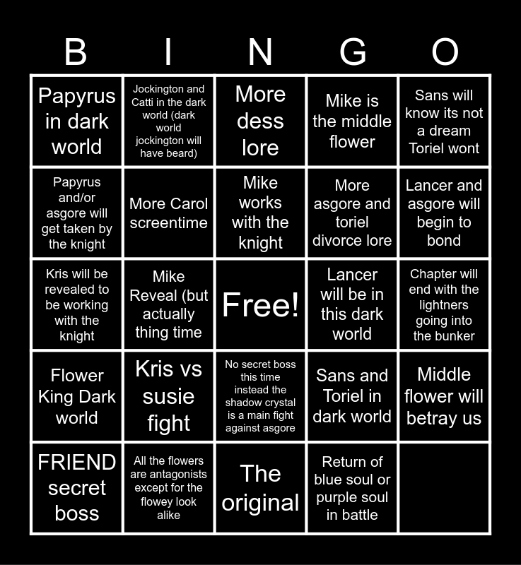 This bingo card has a free space and 24 words: Flower King Dark world, All the flowers are antagonists except for the flowey look alike, No secret boss this time instead the shadow crystal is a main fight against asgore, Sans and Toriel in dark world, Sans will know its not a dream Toriel wont, Papyrus in dark world, Jockington and Catti in the dark world (dark world jockington will have beard), More dess lore, More asgore and toriel divorce lore, Middle flower will betray us, Papyrus and/or asgore will get taken by the knight, More Carol screentime, The middle flower will asborb all the others as the final boss assisted by the knight reminiscent of asriel dreemur, Lancer will be in this dark world, Lancer and asgore will begin to bond, FRIEND secret boss, Mike Reveal (but actually thing time, Mike works with the knight, Mike is the middle flower, Chapter will end with the lightners going into the bunker, Kris will be revealed to be working with the knight, Kris vs susie fight, The original and Return of blue soul or purple soul in battle.