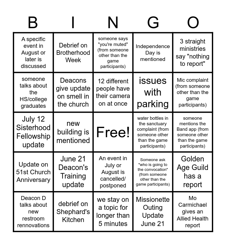 This bingo card has a free space and 34 words: VBS Update, Missionette Outing Update June 21, Abundant Life Update, Mother Harris volunteers for..., Update on 51st Church Anniversary, Deacons give update on smell in the church, 3 straight ministries say "nothing to report", Deacon D talks about new restroom rennovations, Debrief on Brotherhood Week, Global Missions Offering "$20, $40, $60 has to be mentioned", 12 different people have their camera on at once, someone says "you're muted" (from someone other than the game participants), Pastor says "God bless you" or "do we have good sound?", update on what we are doing for Mother Fuller, water bottles in the sanctuary complaint (from someone other than the game participants), Mic complaint (from someone other than the game participants), debrief on Shephard's Kitchen, July 12 Sisterhood Fellowship update, June 21 Deacon's Training update, Someone ask "who is going to the convocation" (from someone other than the game participants), An event in July or August is cancelled/ postponed, Plugged in at Deacon Dennis' house update, A specific event in August or later is discussed, someone mentions the Band app (from someone other than the game participants), we stay on a topic for longer than 5 minutes, Mo Carmichael gives an Allied Health report, Independence Day is mentioned, someone ask for screen sharing privileges, issues with parking, someone talks about the HS/college graduates, Pastor thanks church for Father's Day love offering, new building is mentioned, Golden Age Guild has a report and Summer Friday outreach report.