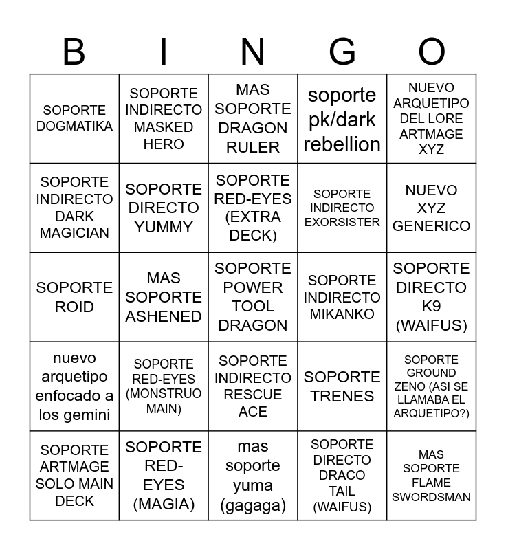 This bingo card has a free space and 24 words: SOPORTE RED-EYES (MONSTRUO MAIN), SOPORTE RED-EYES (MAGIA), SOPORTE RED-EYES (EXTRA DECK), SOPORTE ARTMAGE SOLO MAIN DECK, NUEVO ARQUETIPO DEL LORE ARTMAGE XYZ, SOPORTE DOGMATIKA, SOPORTE INDIRECTO DARK MAGICIAN, SOPORTE INDIRECTO MASKED HERO, SOPORTE INDIRECTO MIKANKO, SOPORTE INDIRECTO RESCUE ACE, SOPORTE INDIRECTO EXORSISTER, SOPORTE ROID, SOPORTE TRENES, SOPORTE GROUND ZENO (ASI SE LLAMABA EL ARQUETIPO?), SOPORTE DIRECTO YUMMY, SOPORTE DIRECTO DRACO TAIL (WAIFUS), SOPORTE DIRECTO K9 (WAIFUS), MAS SOPORTE DRAGON RULER, NUEVO XYZ GENERICO, MAS SOPORTE ASHENED, MAS SOPORTE FLAME SWORDSMAN, nuevo arquetipo enfocado a los gemini, soporte pk/dark rebellion and mas soporte yuma (gagaga).