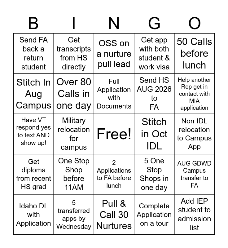 This bingo card has a free space and 24 words: Idaho DL with Application, One Stop Shop before 11AM, Full Application with Documents, Complete Application on a tour, 50 Calls before lunch, Send FA back a return student, Get transcripts from HS directly, OSS on a nurture pull lead, Stitch in Oct IDL, Non IDL relocation to Campus App, Have VT respond yes to text AND show up!, Over 80 Calls in one day, 5 One Stop Shops in one day, AUG GDWD Campus transfer to FA, Stitch In Aug Campus, 5 transferred apps by Wednesday, Pull & Call 30 Nurtures, Get app with both student & work visa, Help another Rep get in contact with MIA application, Get diploma from recent HS grad, Military relocation for campus, 2 Applications to FA before lunch, Send HS AUG 2026 to FA and Add IEP student to admission list.