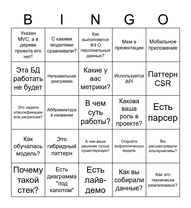 This bingo card has a free space and 24 words: Это гибридный паттерн, Есть диаграмма "под капотом", Какие у вас метрики?, Почему такой стек?, Мобильное приложение, Указан MVC, а в дереве проекта его нет!, Эта БД работать не будет, С какими моделями сравнивали?, Какова ваша роль в проекте?, А чем ваше решение лучше существующих?, Используется API, Это задача классификации или регрессии?, Откройте инфологическую модель, Вы рассматривали альтернативы?, Неправильная диаграмма, Как вы собирали данные?, Есть парсер, Как выполняется ФЗ О персональных данных?, Паттерн CSR, Аббревиатура в названии, Как это технически реализовано?, Как обучалась модель?, Мем в презентации and Есть лайв-демо.