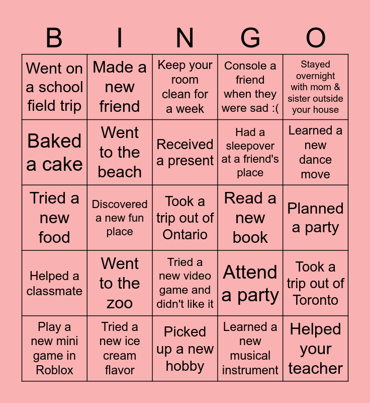 This bingo card has a free space and 24 words: Went to the zoo, Tried a new ice cream flavor, Received a present, Play a new mini game in Roblox, Stayed overnight with mom & sister outside your house, Went on a school field trip, Baked a cake, Made a new friend, Read a new book, Tried a new video game and didn't like it, Had a sleepover at a friend's place, Tried a new food, Attend a party, Took a trip out of Toronto, Went to the beach, Learned a new musical instrument, Planned a party, Keep your room clean for a week, Learned a new dance move, Discovered a new fun place, Helped your teacher, Helped a classmate, Console a friend when they were sad :( and Picked up a new hobby.