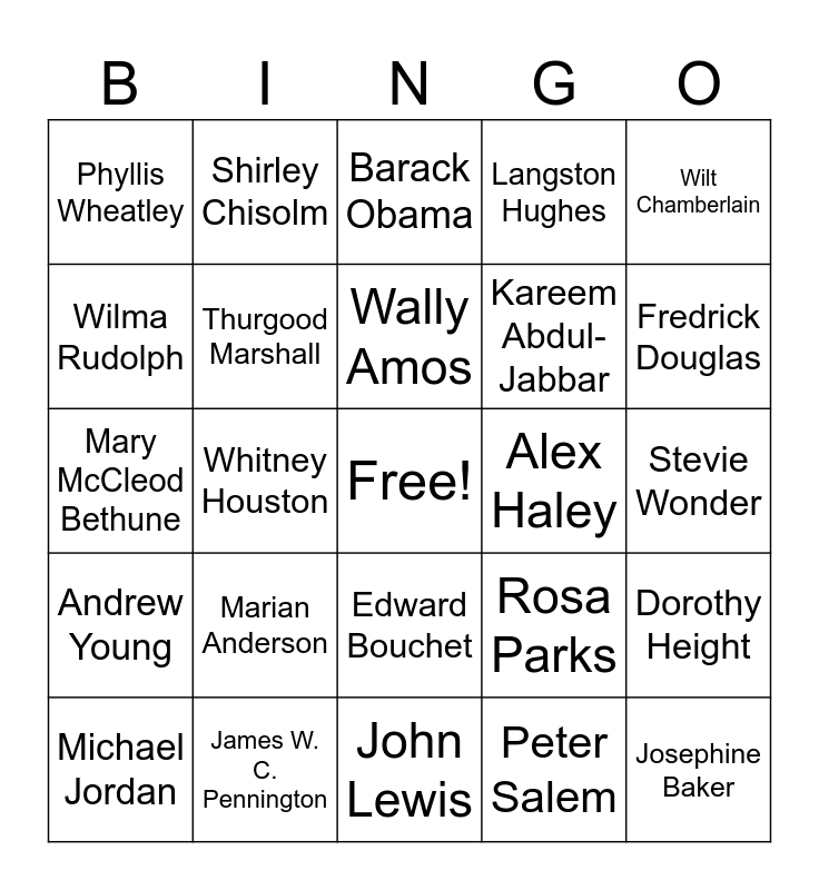 This bingo card has a free space and 49 words: Barry Bonds, Josephine Baker, Nikki Giovanni, John Lewis, Marian Anderson, Serena Williams, Shirley Chisolm, WEB Dubois, Wilma Rudolph, Ruby Bridges, Thurgood Marshall, Langston Hughes, Dorothy Height, Rosa Parks, Whitney Houston, Joel Chandler, Wally Amos, Alex Haley, General Colin Powell, Wilt Chamberlain, Whitney Houston, Peter Salem, Phyllis Wheatley, Kareem Abdul-Jabbar, Harriet Tubman, Fredrick Douglas, Michael Jordan, Nat Turner, Edward Bouchet, Andrew Young, Eric Holder, Tony Dungy, Tina Turner, Dr. Ralph Bunche, James W. C. Pennington, Louis Armstrong, Booker T. Washington, Sidney Poitier, Stevie Wonder, Dr. Samuel Nabrit, Susie King Taylor, Venus Williams, Gwendolyn Brooks, Dr. Charles Drew, Mary McCleod Bethune, Barack Obama, Dr. Martin Luther King Jr, Adam Clayton Powell Jr. and Redd Foxx.