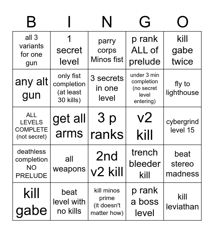 This bingo card has a free space and 24 words: all weapons, beat level with no kills, 3 secrets in one level, kill gabe, kill gabe twice, all 3 variants for one gun, any alt gun, 1 secret level, v2 kill, 2nd v2 kill, under 3 min completion (no secret level entering), ALL LEVELS COMPLETE (not secret), trench bleeder kill, beat stereo madness, only fist completion (at least 30 kills), p rank a boss level, cybergrind level 15, parry corps Minos fist, fly to lighthouse, get all arms, kill leviathan, deathless completion NO PRELUDE, p rank ALL of prelude and kill minos prime (it doesn't matter how).