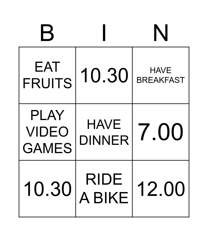 This bingo card has 43 words: EAT VEGETABLES, EAT FRUITS, DRINK WATER, GET UP, Free!, GO TO BED, HAVE BREAKFAST, HAVE LUNCH, HAVE DINNER, WATCH TV, PLAY VIDEO GAMES, LISTEN TO MUSIC, PLAY SPORTS, PLAY IN THE PARK, GO TO SCHOOL, HAVE A BATH, RIDE A BIKE, 7.00, 12.00, 8.30, 10.30, 11.00, EAT VEGETABLES, EAT FRUITS, DRINK WATER, GET UP, GO TO BED, HAVE BREAKFAST, HAVE LUNCH, HAVE DINNER, WATCH TV, PLAY VIDEO GAMES, LISTEN TO MUSIC, PLAY SPORTS, PLAY IN THE PARK, GO TO SCHOOL, HAVE A BATH, RIDE A BIKE, 7.00, 12.00, 8.30, 10.30 and 11.00.