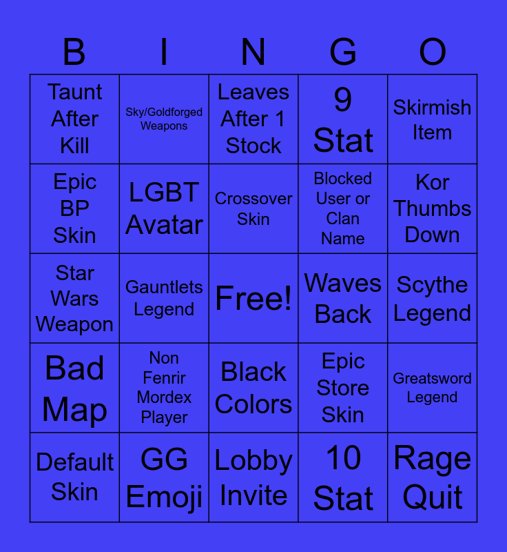 This bingo card has a free space and 24 words: Non Fenrir Mordex Player, GG Emoji, Crossover Skin, Default Skin, Skirmish Item, Taunt After Kill, Epic BP Skin, Sky/Goldforged Weapons, Waves Back, Black Colors, Blocked User or Clan Name, Star Wars Weapon, Epic Store Skin, Greatsword Legend, LGBT Avatar, 10 Stat, Scythe Legend, Leaves After 1 Stock, Kor Thumbs Down, Gauntlets Legend, Rage Quit, Bad Map, 9 Stat and Lobby Invite.