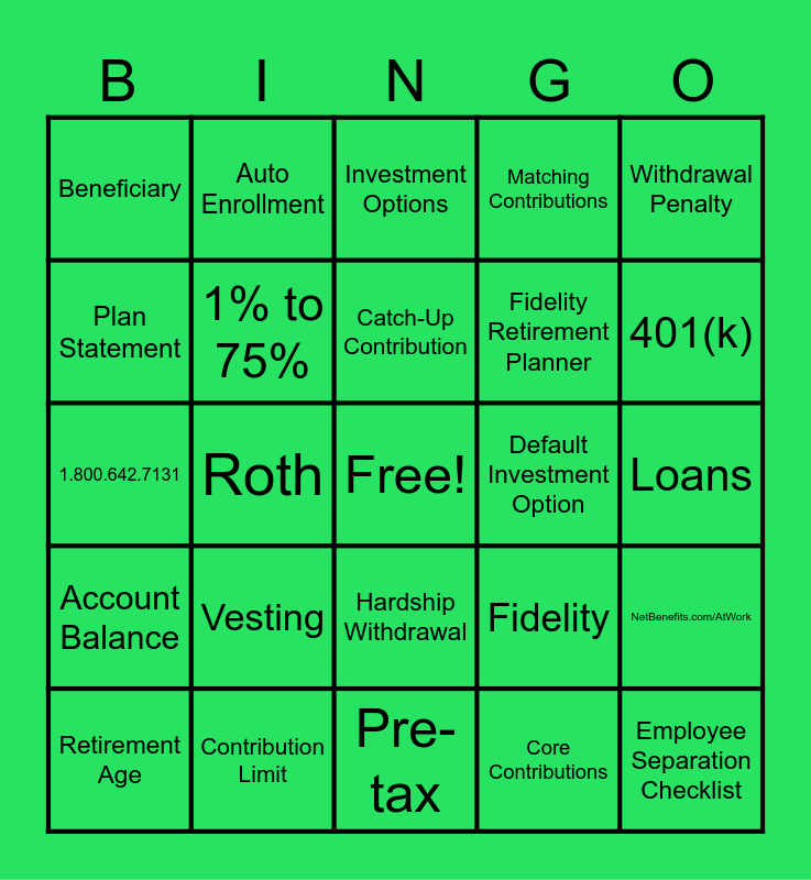 This bingo card has a free space and 24 words: Vesting, Contribution Limit, Catch-Up Contribution, Retirement Age, Withdrawal Penalty, Beneficiary, Plan Statement, Auto Enrollment, Default Investment Option, Hardship Withdrawal, Fidelity Retirement Planner, 1.800.642.7131, Fidelity, NetBenefits.com/AtWork, 1% to 75%, Core Contributions, Loans, Investment Options, 401(k), Roth, Employee Separation Checklist, Account Balance, Matching Contributions and Pre-tax.