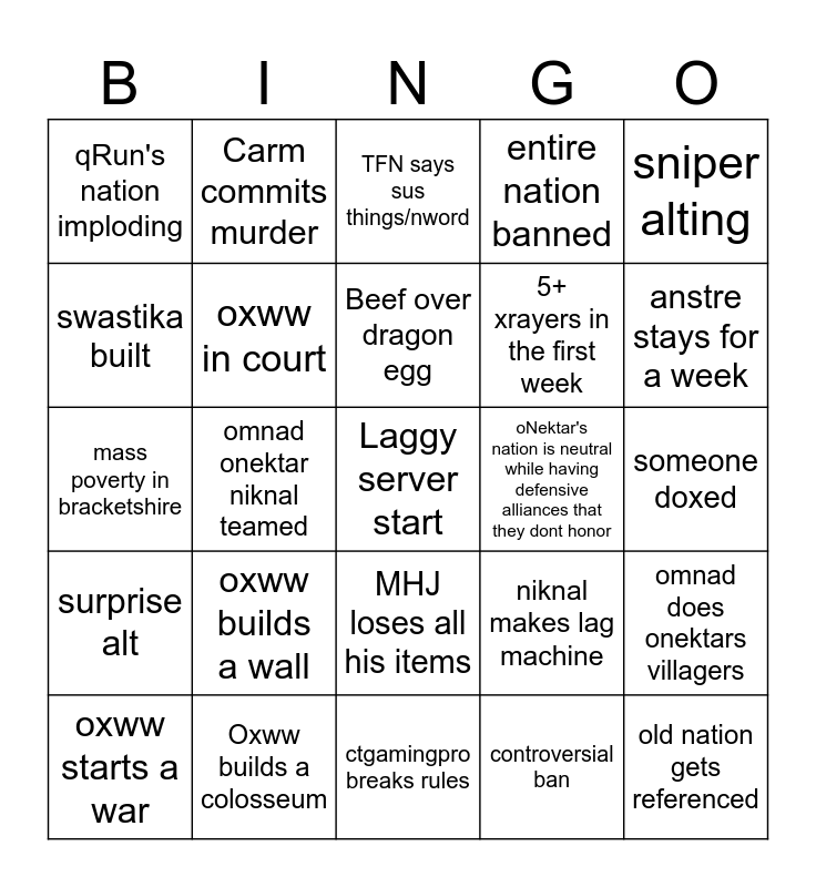 This bingo card has a free space and 24 words: oxww builds a wall, Oxww builds a colosseum, Beef over dragon egg, oxww starts a war, sniper alting, qRun's nation imploding, swastika built, Carm commits murder, oNektar's nation is neutral while having defensive alliances that they dont honor, MHJ loses all his items, 5+ xrayers in the first week, mass poverty in bracketshire, niknal makes lag machine, omnad does onektars villagers, oxww in court, controversial ban, someone doxed, TFN says sus things/nword, anstre stays for a week, omnad onektar niknal teamed, old nation gets referenced, surprise alt, entire nation banned and ctgamingpro breaks rules.