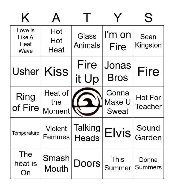 This bingo card has a free space and 29 words: The heat is On, Hot in Hurr, Heat of the Moment, Snoop Dog, Love is Like A Heat Wave, Glass Animals, Kiss, Violent Femmes, Gonna Make U Sweat, Smash Mouth, Hot For Teacher, Donna Summers, Doors, This Summer, Fire, Rolling Stones, Talking Heads, Temperature, Sean Kingston, Ring of Fire, Elvis, Burn Down the House, Jonas Bros, Usher, I'm on Fire, Hot Hot Heat, Sound Garden, Fire it Up and Queen.