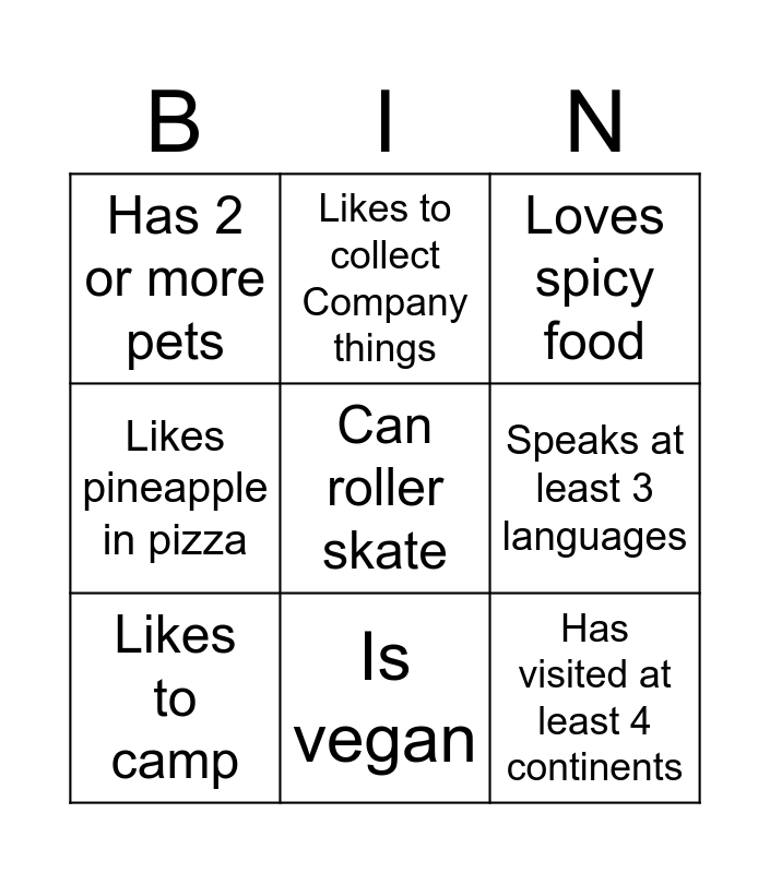 This bingo card has a free space and 8 words: Speaks at least 3 languages, Loves spicy food, Likes to collect Company things, Likes to camp, Has 2 or more pets, Has visited at least 4 continents, Likes pineapple in pizza and Is vegan.