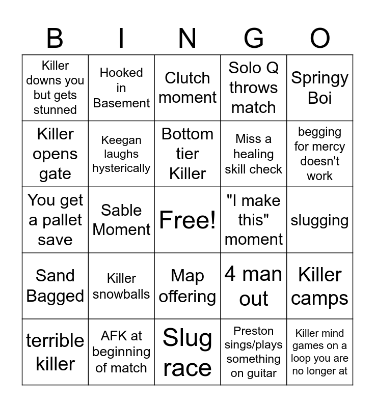 This bingo card has a free space and 148 words: Killer whiff, Keegan misses a skill check, Someone yells at keegan, dying at 3 gens, killer gets a 4k, 4 man out, Killer has pride charm, Someone drops item for the Killer, Drop pallet on wrong side, Insane name, TTV, Preston dies first, Tobi juices, Ghoul tech, Flashlight/bang save, get out using gate while being last alive, Juice for a gen, Demoralizing losing streak, Someone predicts how many people will get out and is wrong, Someone predicts how many people will get out and is right, NOED, Killer camps, Friendly killer, Know 2 killer perks by the end of the trial, Solo q teammate Flashlight/bang save, Sable Moment, Hooked in Basement, Getting genuinely scared, Trapper, Teammate boons a totem, Hex spawning near you, Hatch spawns near you, failed save, slugging, "7 minutes is all I have to spare with you", Solo Q teammate opens chest, Slow vault mind game, Tunneling, Miss a healing skill check, Miss a gen skill check, Interrupted heal, Accidentally kill a teammate, Map offering, DC, bamboozle tech, Leave someone behind, bad doctor, bad hitbox, loop shack until window blocks, Whesker, Whesker throws you but take no damage, Insane killer, terrible killer, Lose to a killer less than p10, Win against killer more than p10, Killer gets auto pulled, Just leave moment, Altruism moment, Indoor map, RPD, Clutch moment, Preston juices but no gens pop, Preston sings/plays something on guitar, dead mans, Gen gets blocked, "I make this" moment, Sand Bagged, God Pallet dropped at 5 gens, Get Mori'd, BP farming, Killer mind games you, You mind game the killer, Killer downs you but gets stunned, lightborn/2 can play gaming, Solo q hides in locker, Someone dies at 5 gens, You get tunneled, Sable flashing you, P100, Solo Q throws match, Gaming death slinger, Someone runs into the killer, Play ruins the game, Solo Q juices, Mikaela, Leon, Get hatch, Both killer addons are purple or better, Someone running double brown addons, Slug race, Witcher skin, Fnaf T-shirt, Solo Q teabags the killer, Someone goes to the bathroom/gets water/etc., AFK at beginning of match, Ken kaneki slugging, Ping teched, Check for kilelr ping and is normal, Pallet stun, blind Killer, Solo Q teammate has a syringe, Solo Q teammate has B.N.P, Killer opens gate, Killer gives up, Killer gives hatch, Killer Moris on hatch, Killer gets undetectable value, Killer has a scourge hook, Someone goes into 2nd because no none got the save, Sabotage a hook, Someone wiggles off, Survivor toxic in endgame chat, Someone 99s gate, Keegan laughs hysterically, Killer snowballs, Killer gets a down while slugging another surv., begging for mercy doesn't work, begging for mercy does work, Killer mind games on a loop you are no longer at, Springy Boi, Pallet save, You get a pallet save, Killer has a meta build, S tier Killer, Bottom tier Killer, get sniped lmao, Die in endgame, Killer has a silly build, Unbreakable value!!!!, Escape 3 matches, Killer finds someone before hatch spawns, abandon a match, abandon 2 matches in a row, Altruism BP offering, Objectives BP offering, Teammate has a silly build, Teammate allergic to gens, Get downed from exposed, Plot twist gets found, Solo Q pallet save, Killer chucks his weapon a you, Someone unhooks you right next to killer, dead dawg, Killer has only less than 4 hooks when all gens are completed, A survivors fit makes no sense, save someone on hook during endgame, trade for someone on hook and take a hit.
