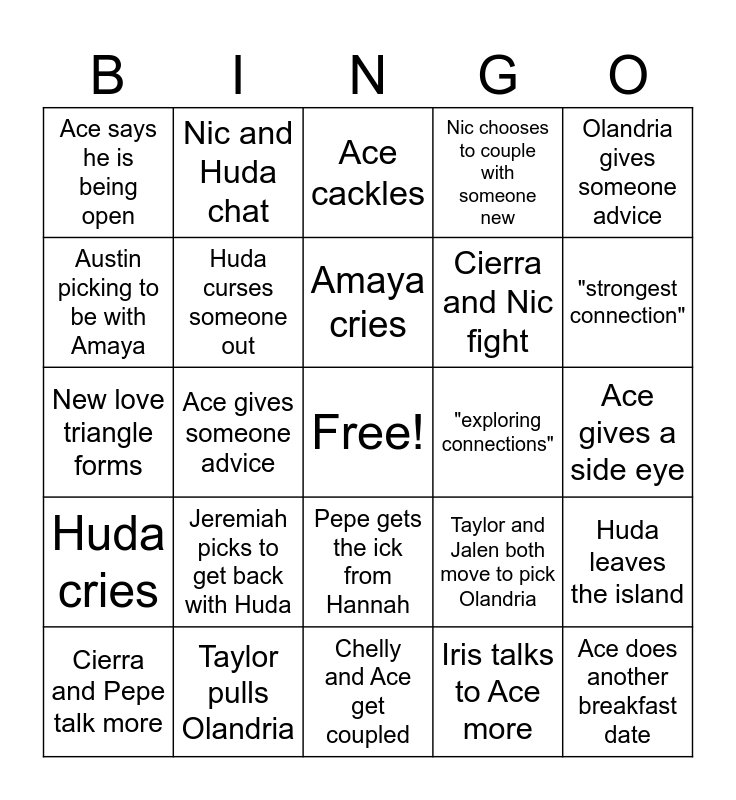 This bingo card has a free space and 24 words: Jeremiah picks to get back with Huda, Taylor pulls Olandria, Amaya cries, Cierra and Pepe talk more, Olandria gives someone advice, Ace says he is being open, Austin picking to be with Amaya, Nic and Huda chat, "exploring connections", Pepe gets the ick from Hannah, Cierra and Nic fight, New love triangle forms, Taylor and Jalen both move to pick Olandria, Huda leaves the island, Huda curses someone out, Iris talks to Ace more, Ace gives a side eye, Ace cackles, "strongest connection", Ace gives someone advice, Ace does another breakfast date, Huda cries, Nic chooses to couple with someone new and Chelly and Ace get coupled.