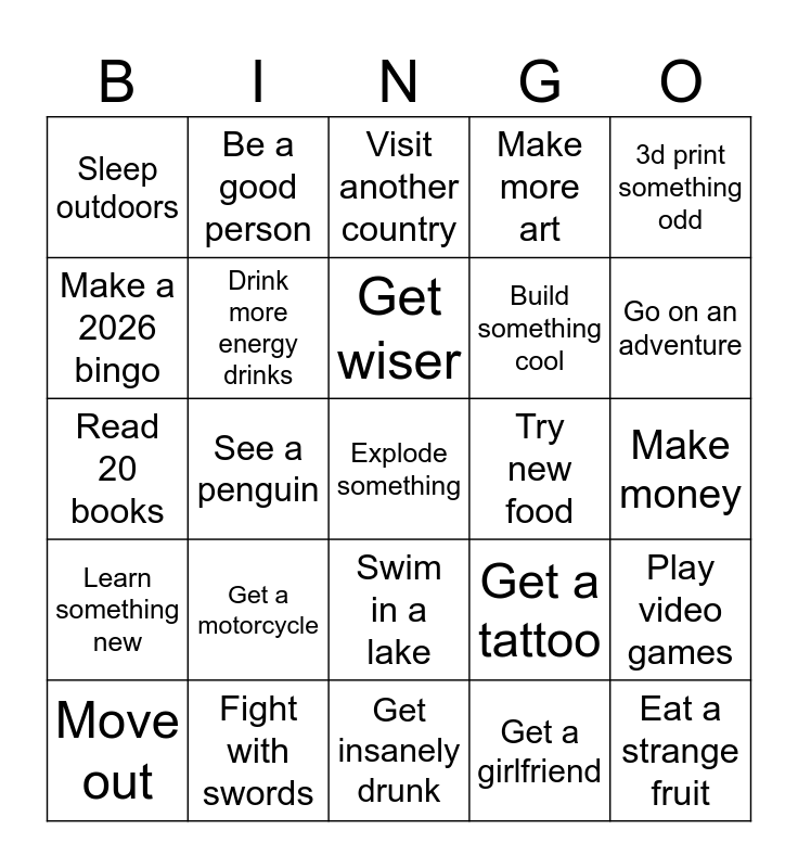 This bingo card has 25 words: Get a motorcycle, Get insanely drunk, Get wiser, Move out, 3d print something odd, Sleep outdoors, Make a 2026 bingo, Be a good person, Try new food, Swim in a lake, Build something cool, Read 20 books, Get a tattoo, Play video games, Drink more energy drinks, Eat a strange fruit, Make money, Visit another country, Go on an adventure, See a penguin, Explode something, Fight with swords, Learn something new, Make more art and Get a girlfriend.