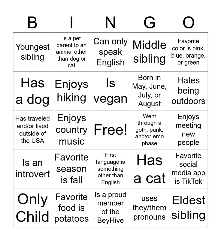 This bingo card has a free space and 24 words: Favorite season is fall, Favorite food is potatoes, Is vegan, Only Child, Favorite color is pink, blue, orange, or green, Youngest sibling, Has a dog, Is a pet parent to an animal other than dog or cat, Went through a goth, punk, and/or emo phase, First language is something other than English, Born in May, June, July, or August, Has traveled and/or lived outside of the USA, Has a cat, Favorite social media app is TikTok, Enjoys hiking, uses they/them pronouns, Enjoys meeting new people, Can only speak English, Hates being outdoors, Enjoys country music, Eldest sibling, Is an introvert, Middle sibling and Is a proud member of the BeyHive.