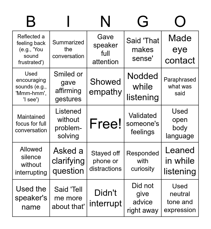 This bingo card has a free space and 24 words: Asked a clarifying question, Said 'Tell me more about that', Showed empathy, Used the speaker's name, Made eye contact, Reflected a feeling back (e.g., 'You sound frustrated'), Used encouraging sounds (e.g., 'Mmm-hmm', 'I see'), Summarized the conversation, Validated someone's feelings, Stayed off phone or distractions, Nodded while listening, Maintained focus for full conversation, Responded with curiosity, Leaned in while listening, Smiled or gave affirming gestures, Did not give advice right away, Used open body language, Gave speaker full attention, Paraphrased what was said, Listened without problem-solving, Used neutral tone and expression, Allowed silence without interrupting, Said 'That makes sense' and Didn't interrupt.