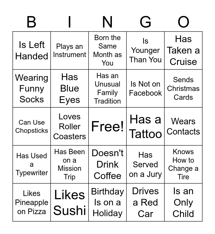 This bingo card has a free space and 24 words: Has Been on a Mission Trip, Likes Sushi, Has an Unusual Family Tradition, Likes Pineapple on Pizza, Has Taken a Cruise, Is Left Handed, Wearing Funny Socks, Plays an Instrument, Has a Tattoo, Doesn't Drink Coffee, Is Not on Facebook, Can Use Chopsticks, Has Served on a Jury, Knows How to Change a Tire, Has Blue Eyes, Drives a Red Car, Wears Contacts, Born the Same Month as You, Sends Christmas Cards, Loves Roller Coasters, Is an Only Child, Has Used a Typewriter, Is Younger Than You and Birthday Is on a Holiday.