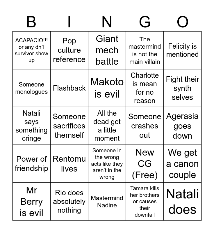 This bingo card has 25 words: Rentomu lives, Mastermind Nadine, Makoto is evil, Mr Berry is evil, Felicity is mentioned, ACAPACIO!!! or any dh1 survivor show up, Someone monologues, Pop culture reference, Someone crashes out, Someone in the wrong acts like they aren’t in the wrong, Charlotte is mean for no reason, Natali says something cringe, New CG (Free), We get a canon couple, Flashback, Natali does, Agerasia goes down, Giant mech battle, Fight their synth selves, Someone sacrifices themself, All the dead get a little moment, Rio does absolutely nothing, Power of friendship, The mastermind is not the main villain and Tamara kills her brothers or causes their downfall.