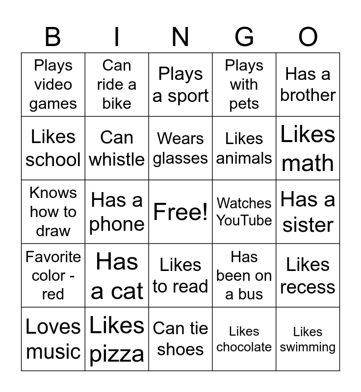 This bingo card has a free space and 24 words: Has a cat, Likes pizza, Wears glasses, Loves music, Has a brother, Plays video games, Likes school, Can ride a bike, Watches YouTube, Likes to read, Likes animals, Knows how to draw, Has been on a bus, Likes recess, Can whistle, Likes chocolate, Has a sister, Plays a sport, Likes math, Has a phone, Likes swimming, Favorite color -red, Plays with pets and Can tie shoes.