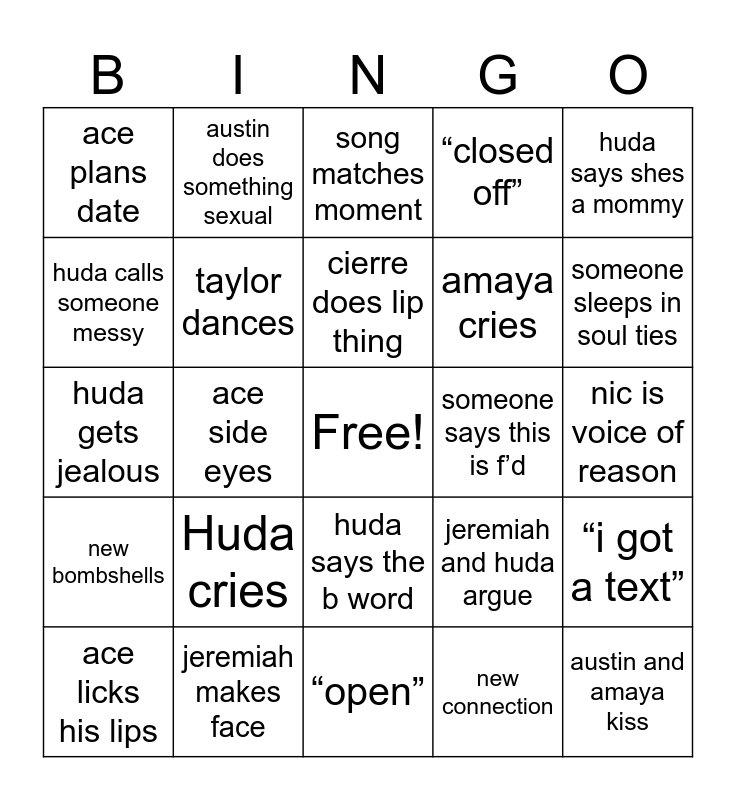 This bingo card has a free space and 24 words: Huda cries, jeremiah makes face, cierre does lip thing, ace licks his lips, huda says shes a mommy, ace plans date, huda calls someone messy, austin does something sexual, someone says this is f’d, huda says the b word, amaya cries, huda gets jealous, jeremiah and huda argue, “i got a text”, taylor dances, new connection, nic is voice of reason, song matches moment, someone sleeps in soul ties, ace side eyes, austin and amaya kiss, new bombshells, “closed off” and “open”.