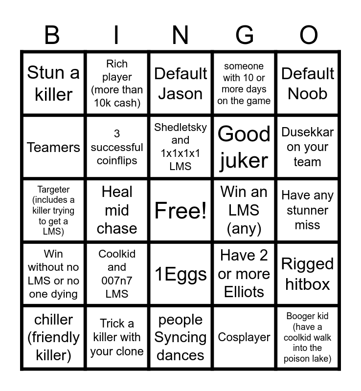 This bingo card has a free space and 24 words: chiller (friendly killer), Coolkid and 007n7 LMS, Shedletsky and 1x1x1x1 LMS, Cosplayer, Default Noob, Stun a killer, Rich player (more than 10k cash), Default Jason, Win an LMS (any), Have any stunner miss, Targeter (includes a killer trying to get a LMS), 3 successful coinflips, Have 2 or more Elliots, Rigged hitbox, Teamers, Trick a killer with your clone, people Syncing dances, someone with 10 or more days on the game, Dusekkar on your team, Win without no LMS or no one dying, Heal mid chase, 1Eggs, Good juker and Booger kid (have a coolkid walk into the poison lake).
